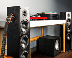 Wide dispersion drivers and tweeters project sound over a wide area so every listener in a room hears open, “box-less,” three-dimensional sound.